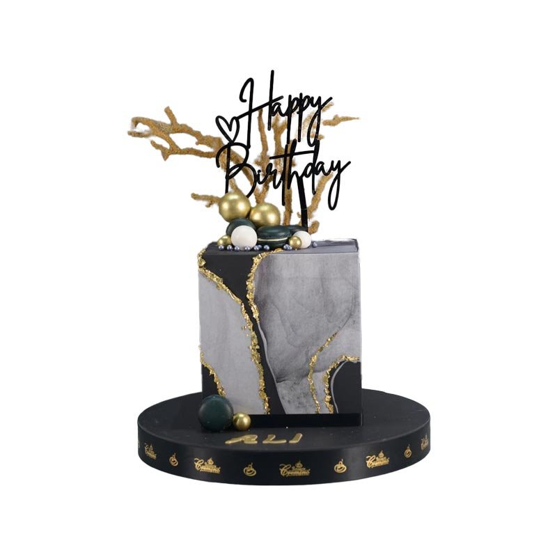 Our grey Marble Cake is the epitome of style and taste. This exquisite Happy Birthday Cake features a black fondant-covered cake wrapped in a stunning grey marble design. An assortment of black and gold balls adorns the top, making it a truly eye-catching Birthday Cake for any celebration.