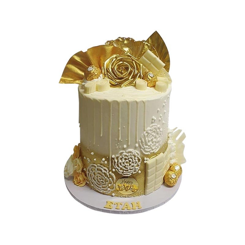 Elevate your celebration with our Gold and White Ferrero Rocher theme cake, a stunning custom birthday cake that’s as elegant as it is delicious. Adorned with luxurious macarons and Ferrero Rocher chocolates, this cake creates an irresistible treat for any special occasion. The gold and white design adds a touch of sophistication, making it a perfect centerpiece for your celebration. Crafted with care, this custom cake is sure to impress and delight your recipient.