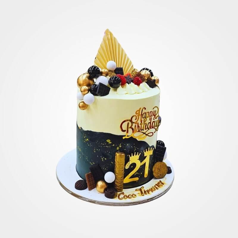 Decorated with a golden fan, chocolate spheres, fresh raspberries, mini chocolate bars, and edible gold coins around the base, this black drip cake is perfect for milestone birthday cake celebrations or stylish parties. It’s ideal for men, chocolate lovers, or anyone who appreciates a touch of modern sophistication.
