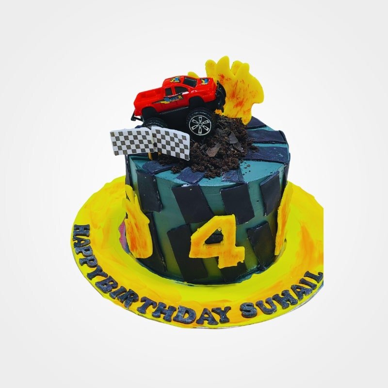 This Monster Truck Cake is pure, high-octane fun for adventurous celebrations. The bold checkered patterned cake is decorated with fiery flames and topped with a red monster truck crushing a pile of edible dirt beside a checkered flag—all crafted with rich, smooth fresh cream for a delicious finish.