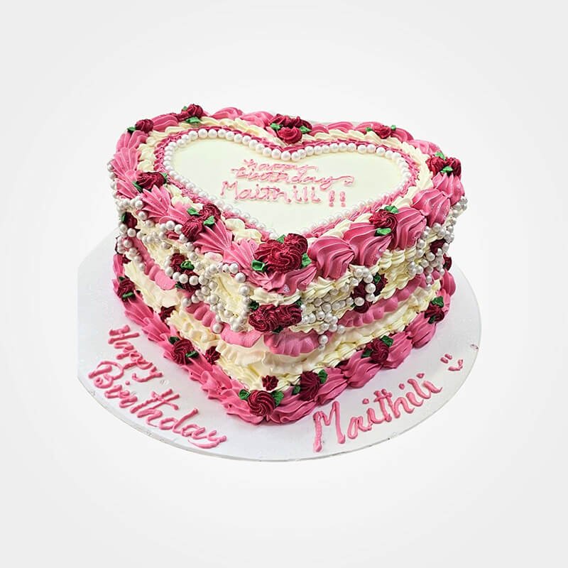 The Vintage Heart Cake is a romantic masterpiece that perfectly blends timeless elegance with delicate detail. This heart-shaped vintage cake features elaborate pink and cream piping, including soft ruffles and shells made with smooth fresh cream. Adorned with beautiful red roses and elegant pearl accents, it creates a truly special centerpiece.